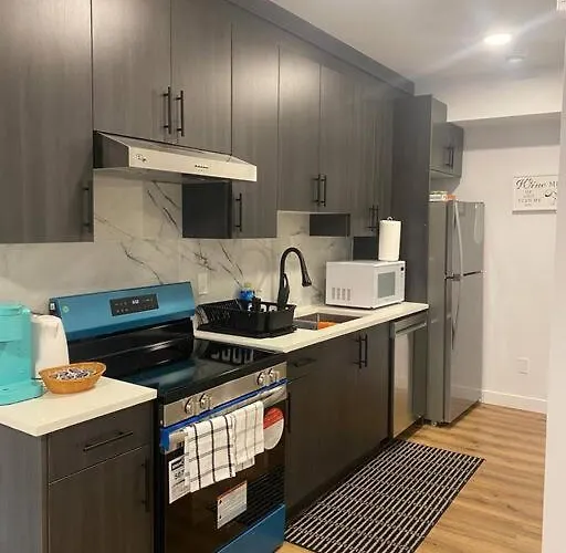 Een complete keuken in deze villa bevat alles wat je nodig hebt, waaronder een magnetron, een waterkoker en een koelkast. Gasten zullen genieten van gerechten uit de Ierse keuken, geserveerd in Duggan's Boundary Irish Pub, dat op 16 minuten loopafstand ervandaan ligt. Pebbles' Cozy 2Bed Basement Suite - Near Downtown ligt op ongeveer ut 15 minuten rijden van de luchthaven Edmonton City Centre.